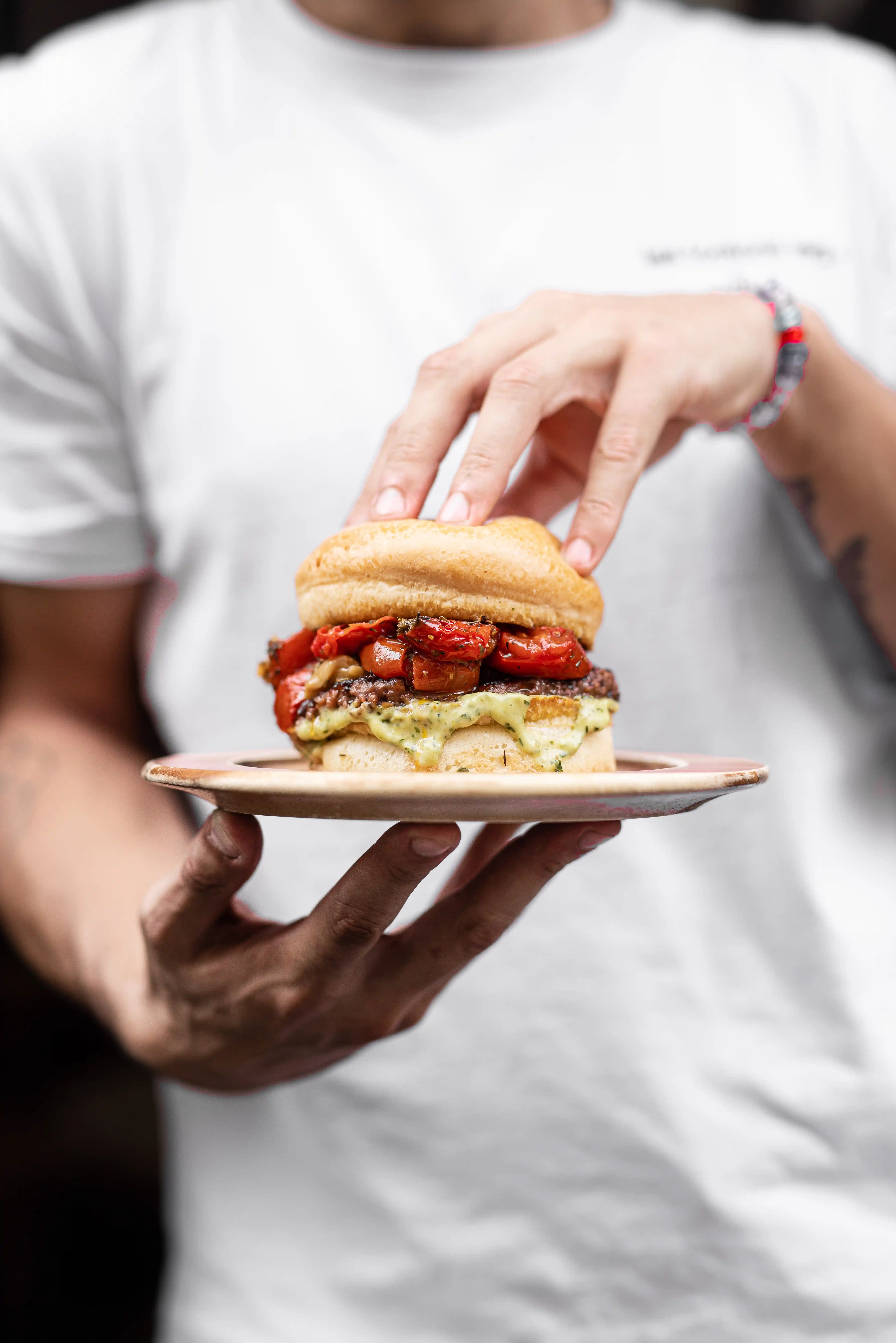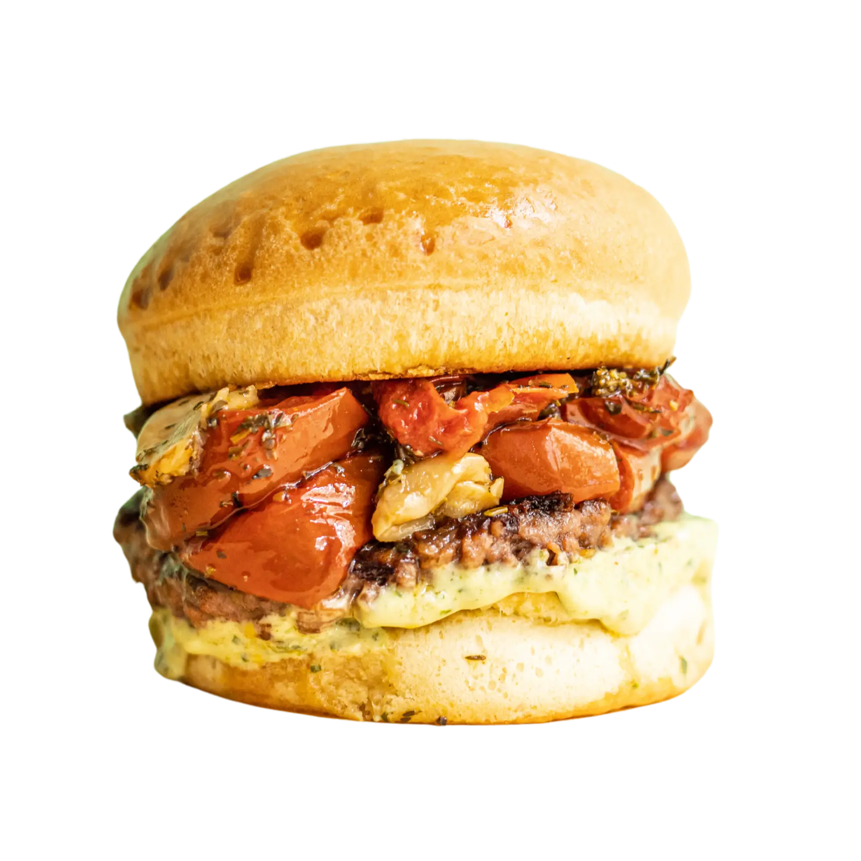 Steak beyond, mayo pistou, tomates San marzano confites à la provençale, ail confit et fromage frais aux herbes de Provence.