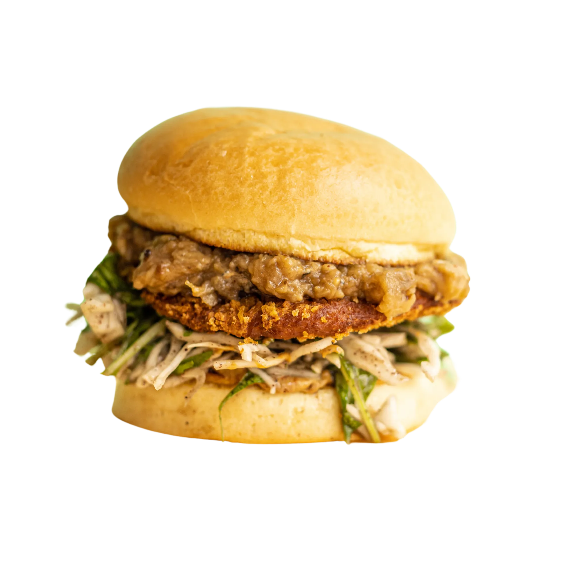 Seitan façon fried chicken, sauce mayo ail noir piment d'espelette, caviar d'aubergines aux épices du trappeur et salade chou blanc mizuna à la crÚme de sésame.